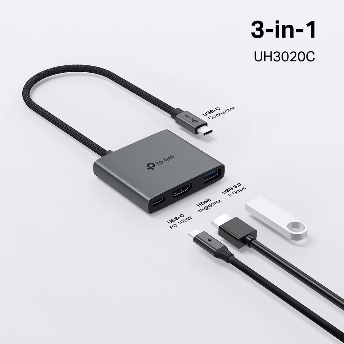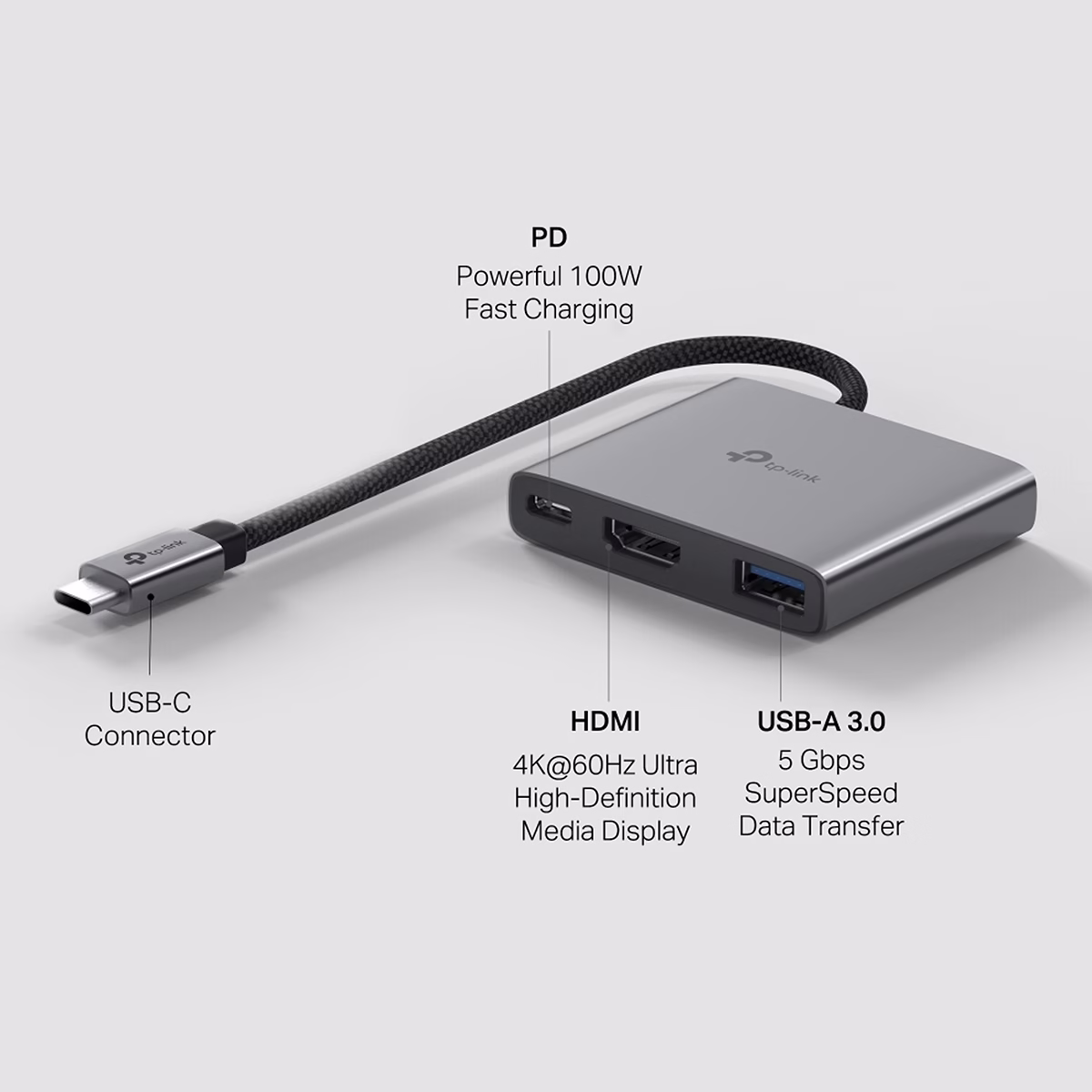 Adaptador USB-C a HDMI 3 en 1 TP-LINK UH3020C HDMI 4K@60Hz USB 5Gbps PD 100W de Carga