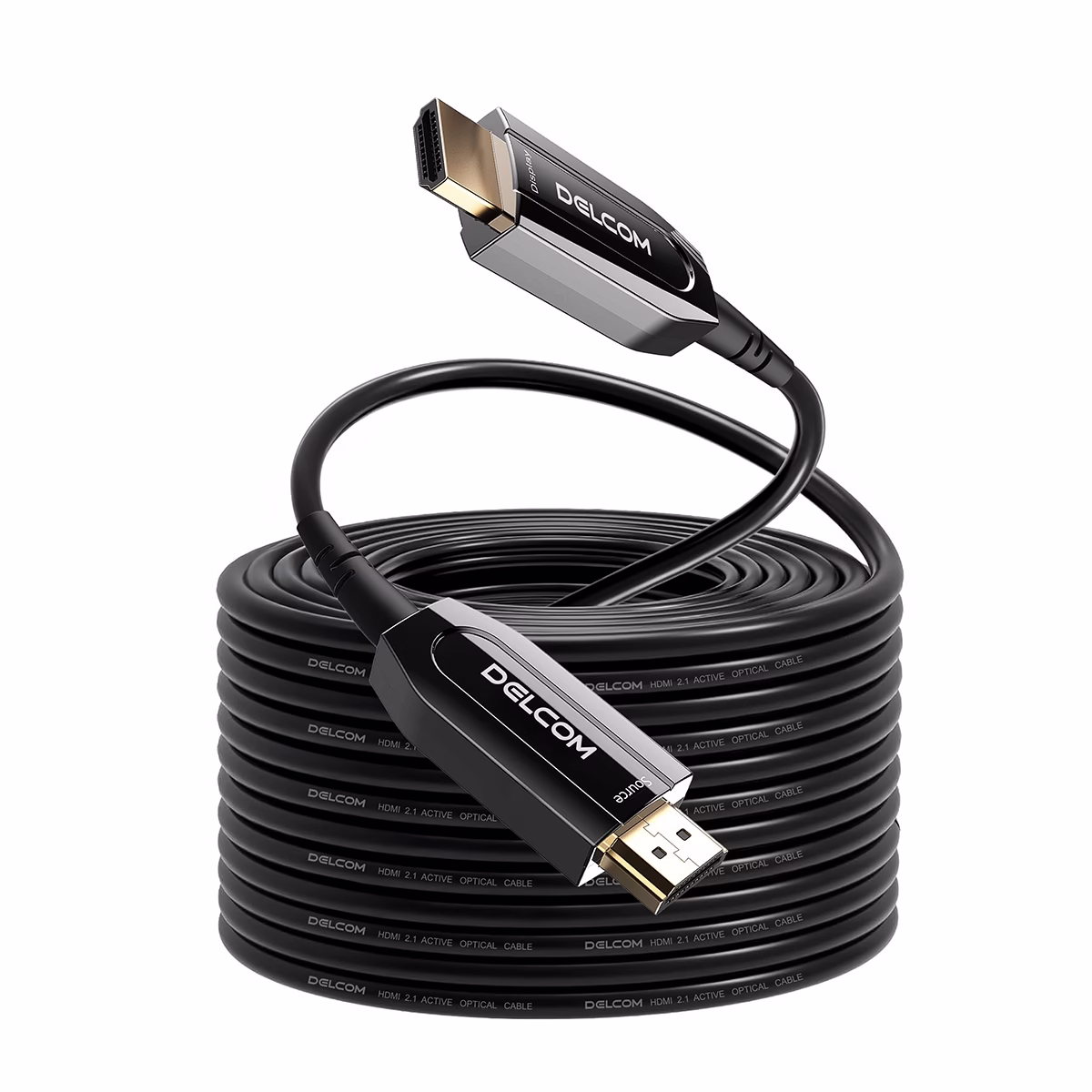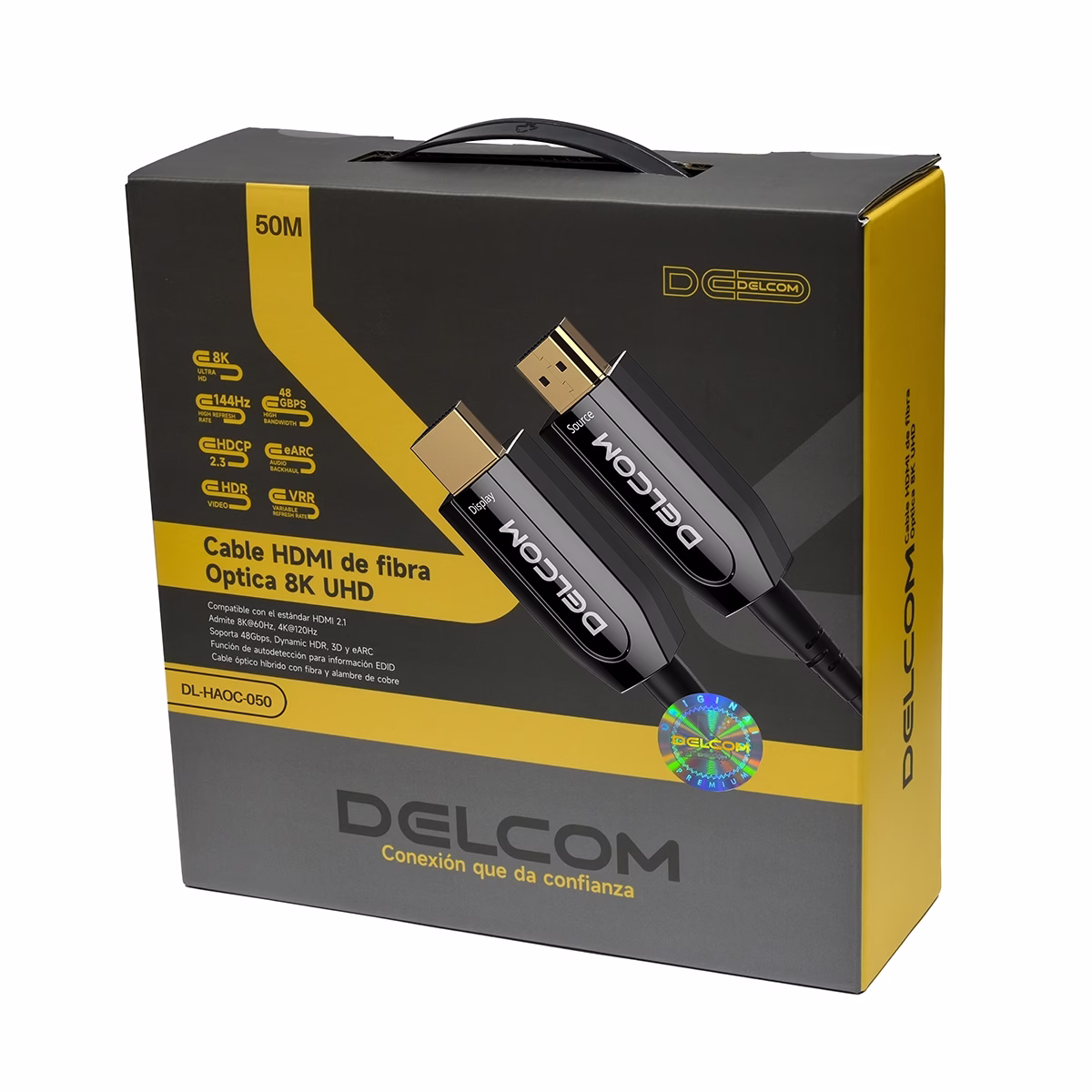 La solución es la Fibra Óptica. El Cable HDMI 50MT 8K versión 2.1 Activo de Fibra Óptica (AOC) Delcom DL-HAOC-050 es una obra maestra de la ingeniería. Este cable de vanguardia convierte la señal HDMI en pulsos de luz, permitiéndole viajar 50 metros sin la más mínima pérdida de calidad, latencia o interferencia. Es la única forma de garantizar el ancho de banda completo de 48Gbps para 8K@60Hz, 4K@120Hz, VRR y audio eARC a largas distancias.