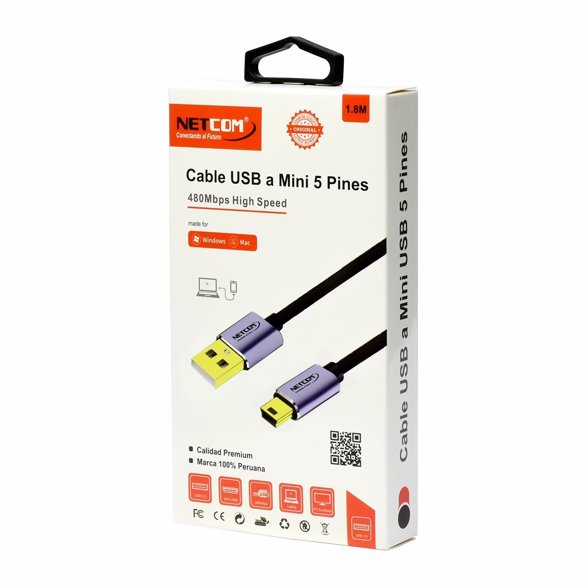El Cable Mini USB 5 Pines, calidad Premium en la marca NETCOM PE-CA0114 es la solución definitiva. Este cable de 1.8 metros no es un cable común; está construido para durar. Su cubierta enmallada de nylon, conectores de aleación de aluminio y núcleo 100% cobre puro garantizan una carga segura (hasta 2A) y una transferencia de datos de 480Mbps estable y sin errores.
