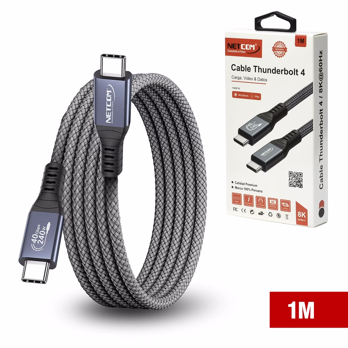 El Cable Thunderbolt 4 NETCOM PE-PH0267 es la solución definitiva para el usuario de alta gama. Es el único cable que necesitarás para manejar video 8K, carga de 240W y datos a 40Gbps en un solo cable de 1 metro, duradero y confiable.