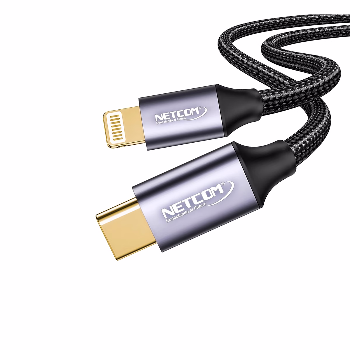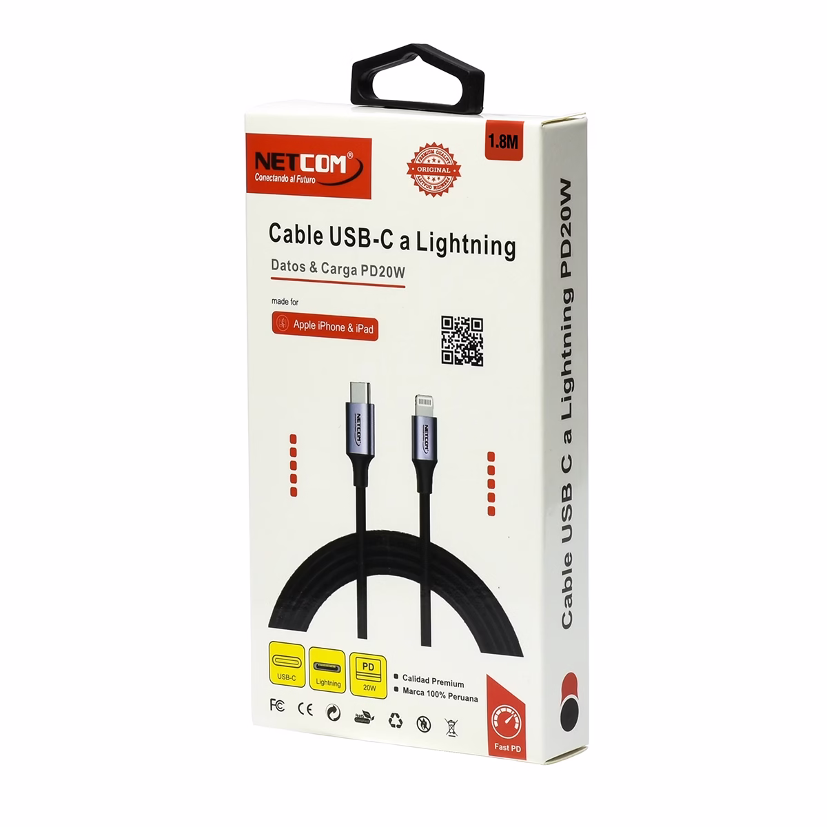 El Cable USB-C a Lightning Premium NETCOM PE-AC0113 es la conexión robusta, rápida y confiable que tu iPhone merece. Su longitud de 1.8m te da la comodidad que el cable original no ofrece, y su construcción enmallada te da la durabilidad que necesitas.