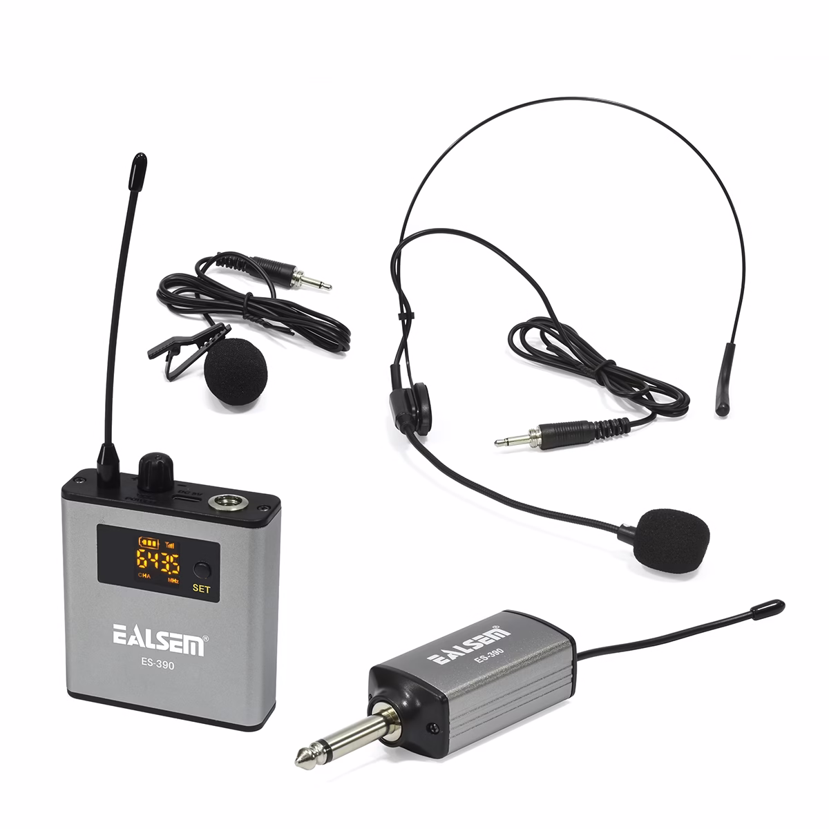 El modelo ES-390 destaca por su versatilidad: el kit incluye tanto un micrófono solapero (ideal para entrevistas o presentaciones formales) como un micrófono de vincha (perfecto para instructores de gimnasio, profesores o expositores que mueven mucho la cabeza). Su cuerpo fabricado en plástico ABS gris oscuro es ligero y resistente, pensado para el uso diario.